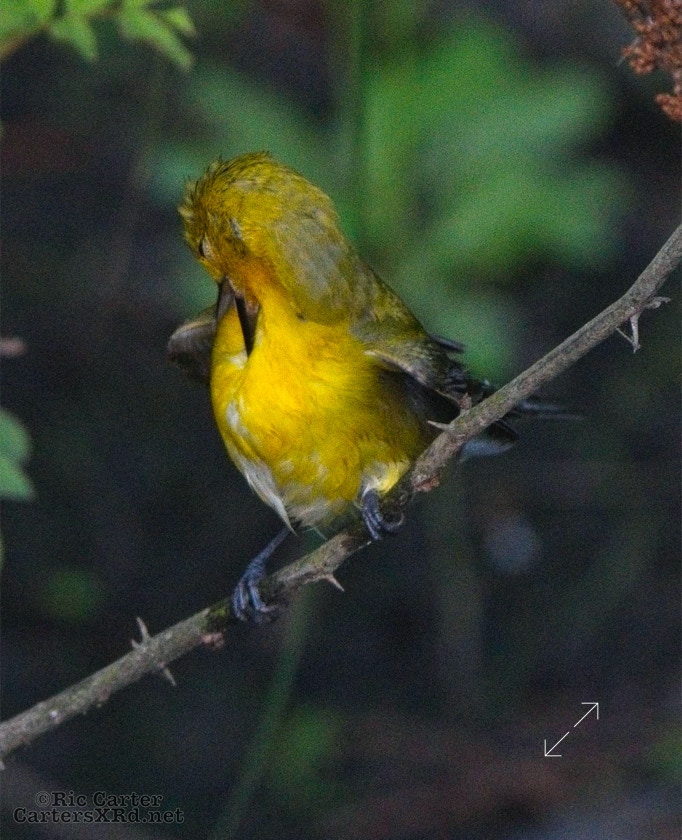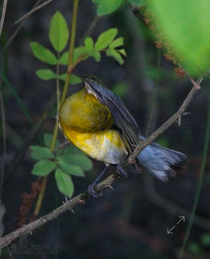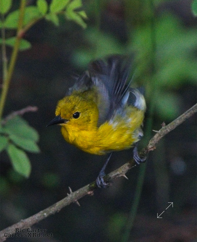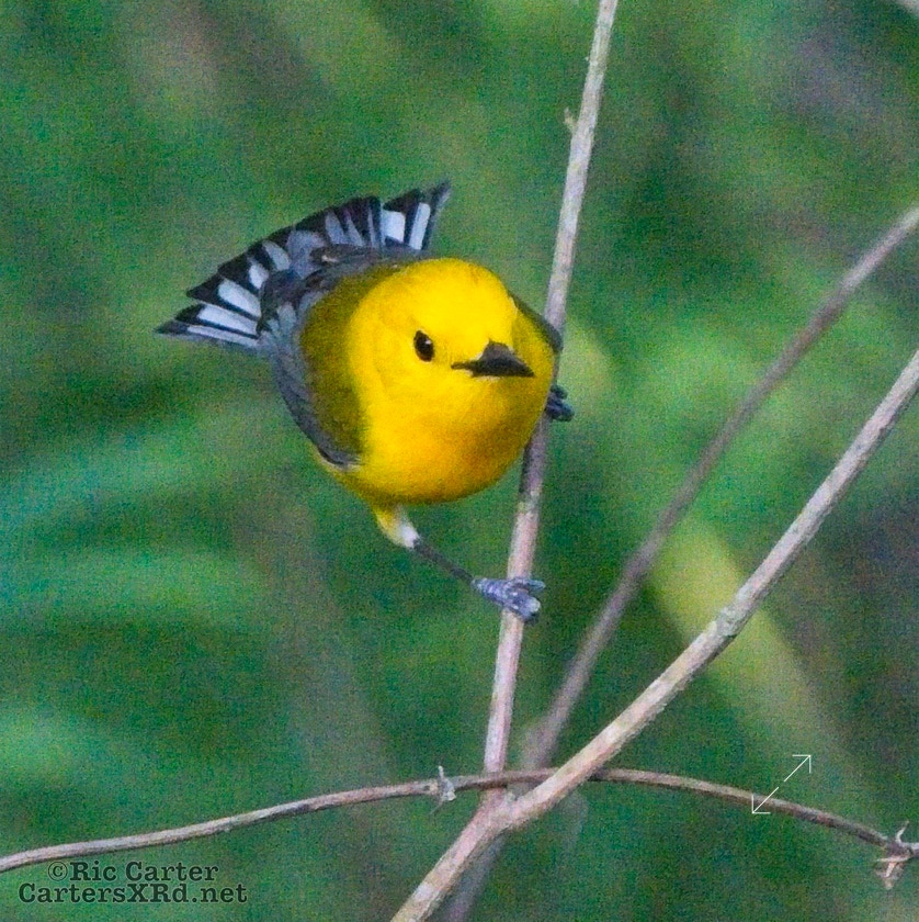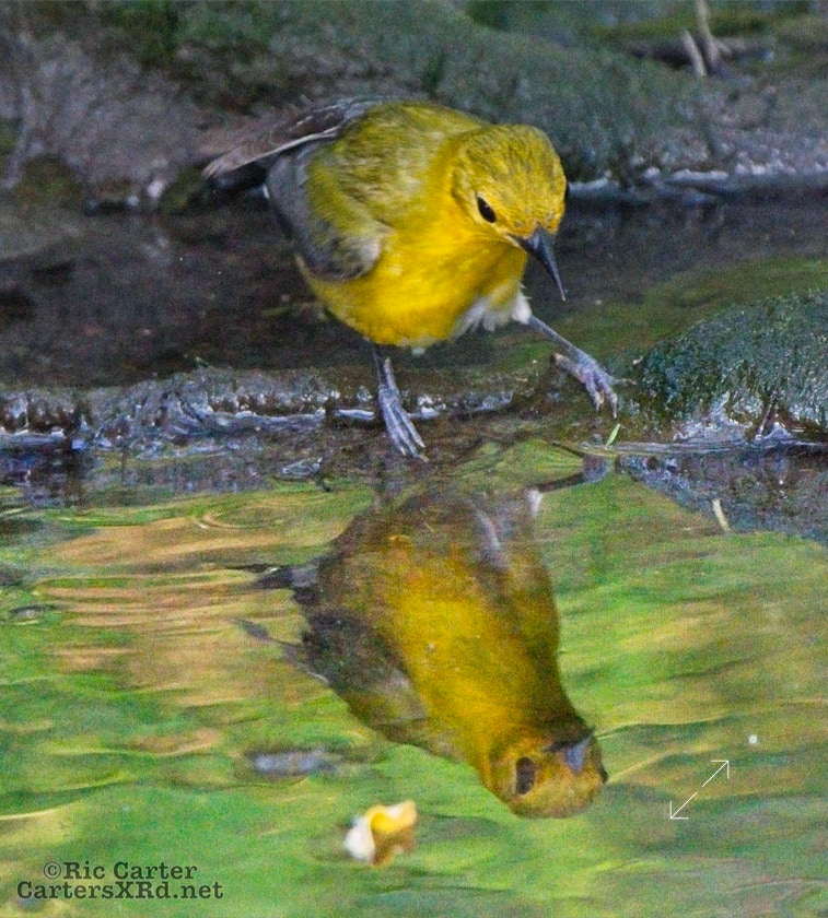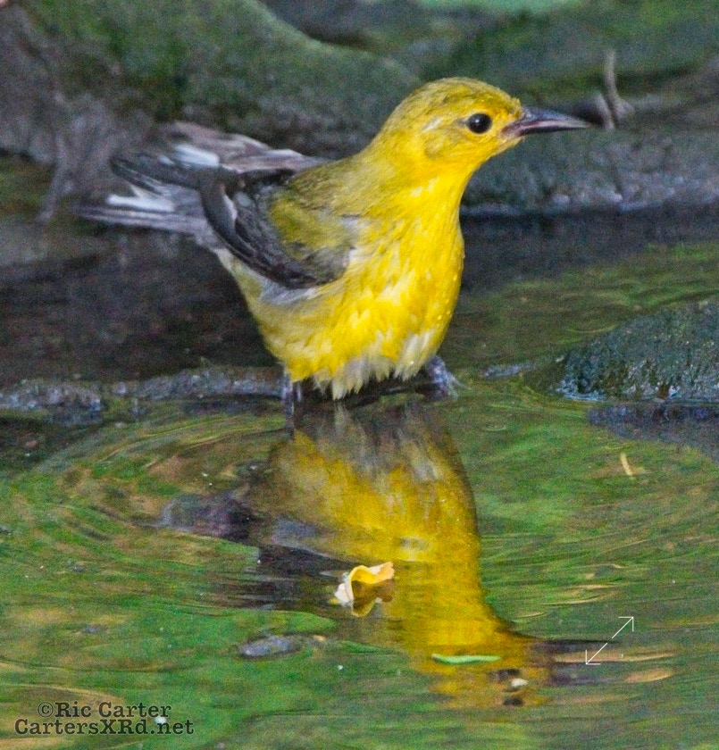 We had a pair of golden warblers nest in the yard last year. We think they returned a couple of weeks ago. On May 5, they both were “friendly” and did not startle too seriously as we sat on the pier. The female enjoyed a bath in Tranters Creek before the male showed up to admire her.