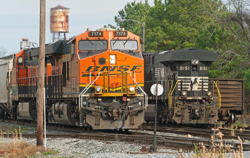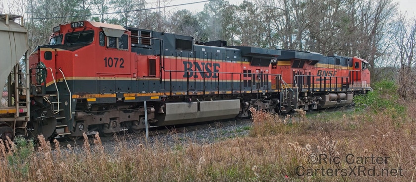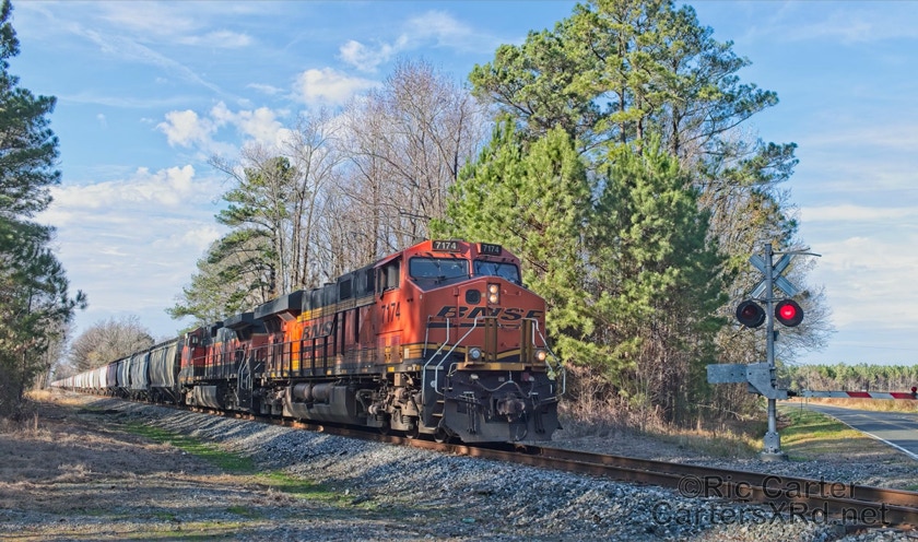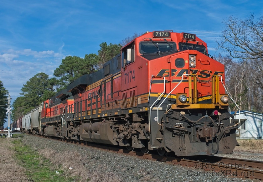What a nice way to round out the train year — a little holiday color added to the yard in Chocowinity. Two BNSF units overnighted in the yard awaiting a December 29 phosphate unit train (60U). Here are pictures in the yard and passing through Vanceboro on its way west.