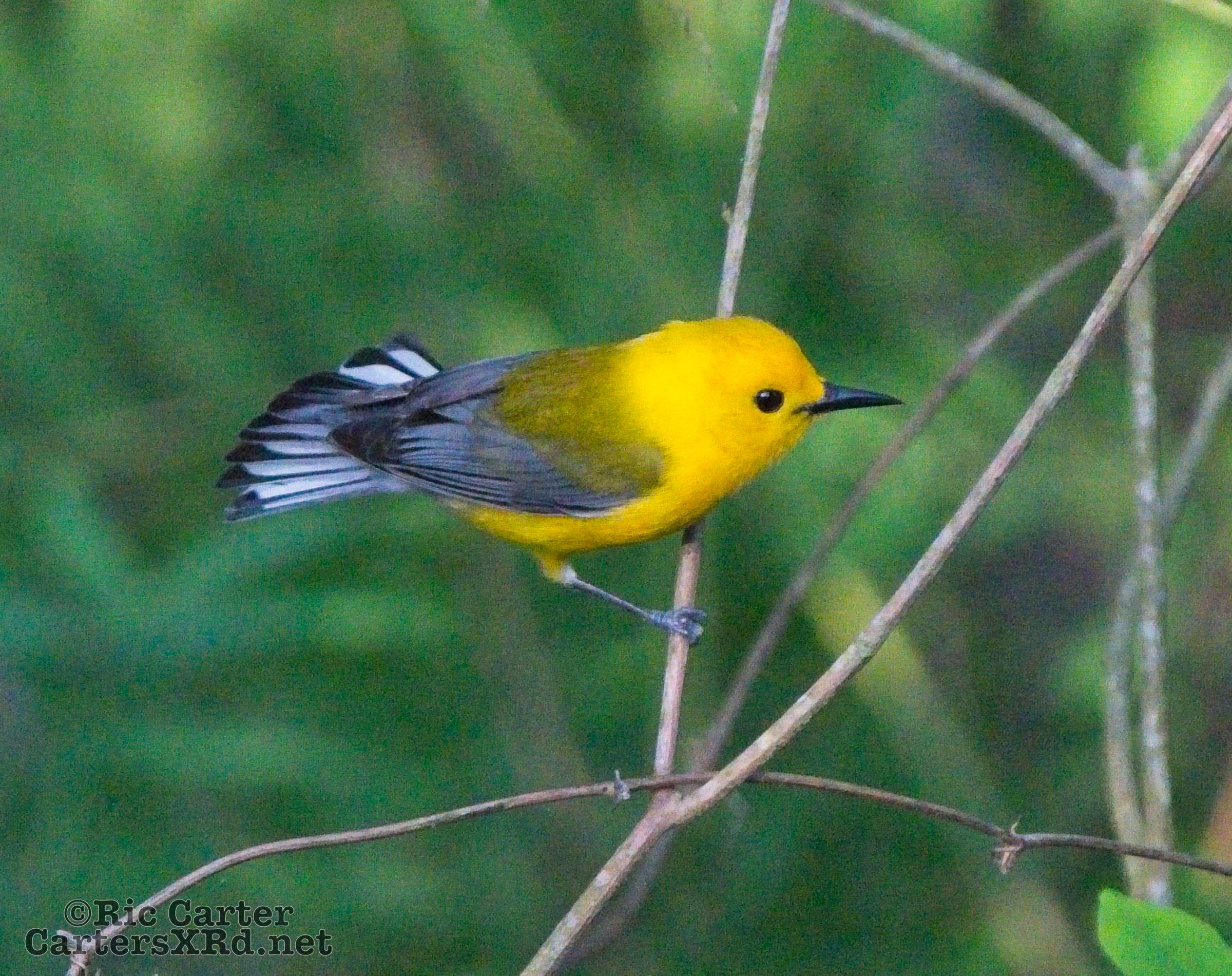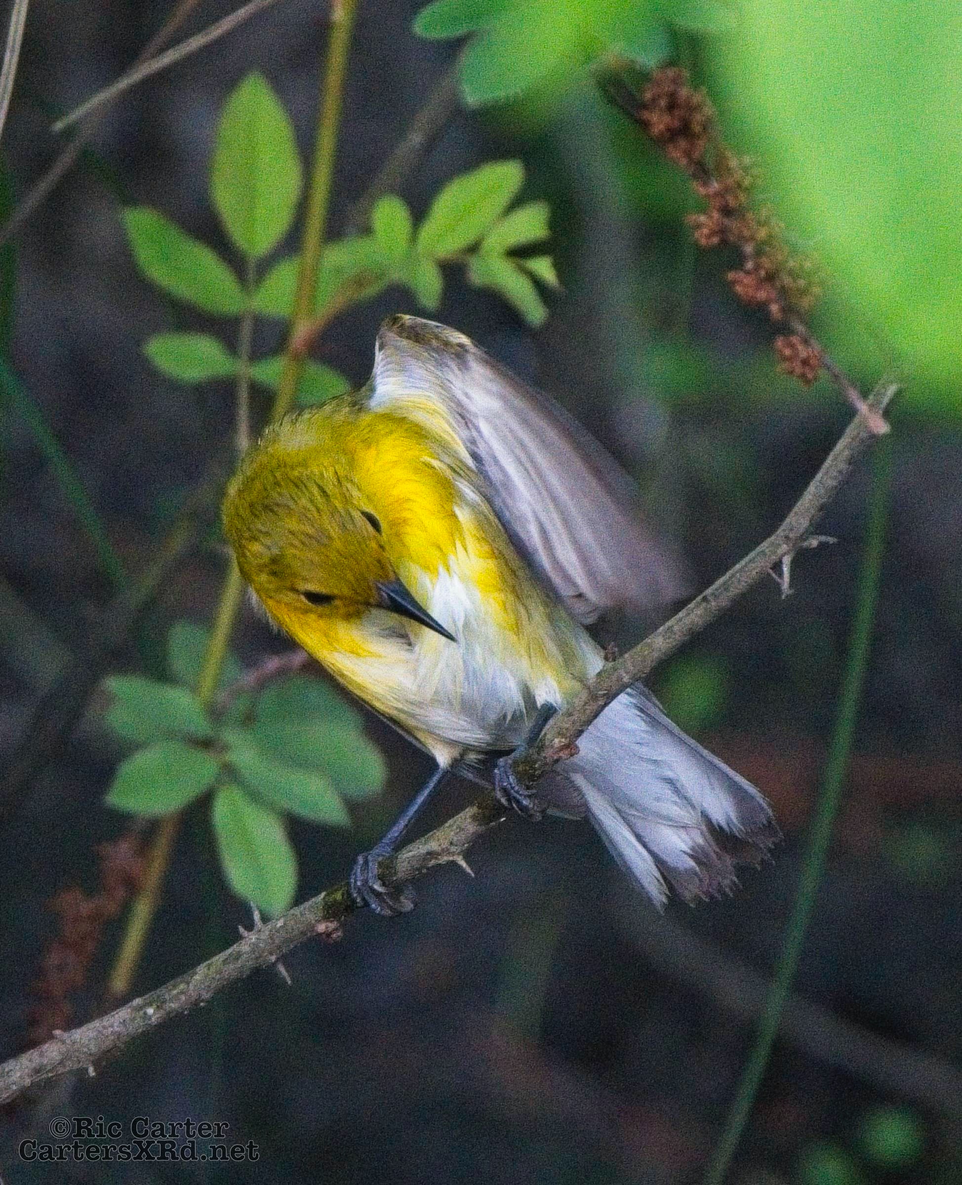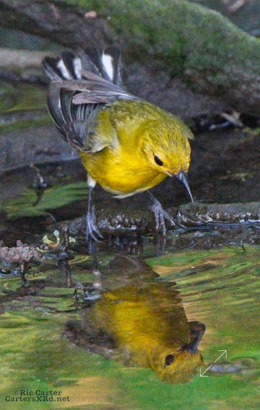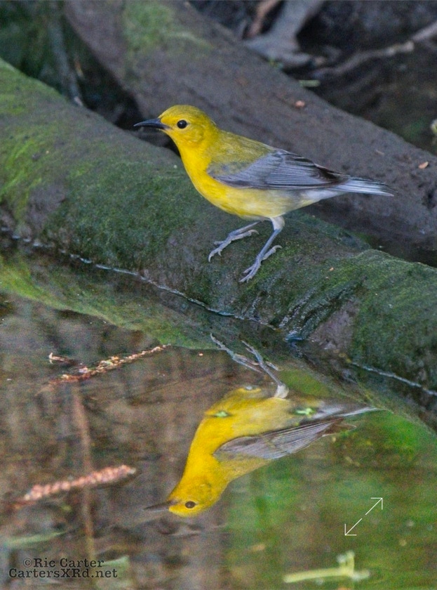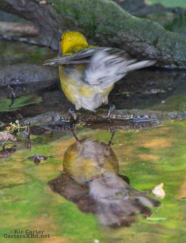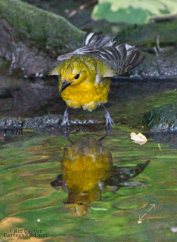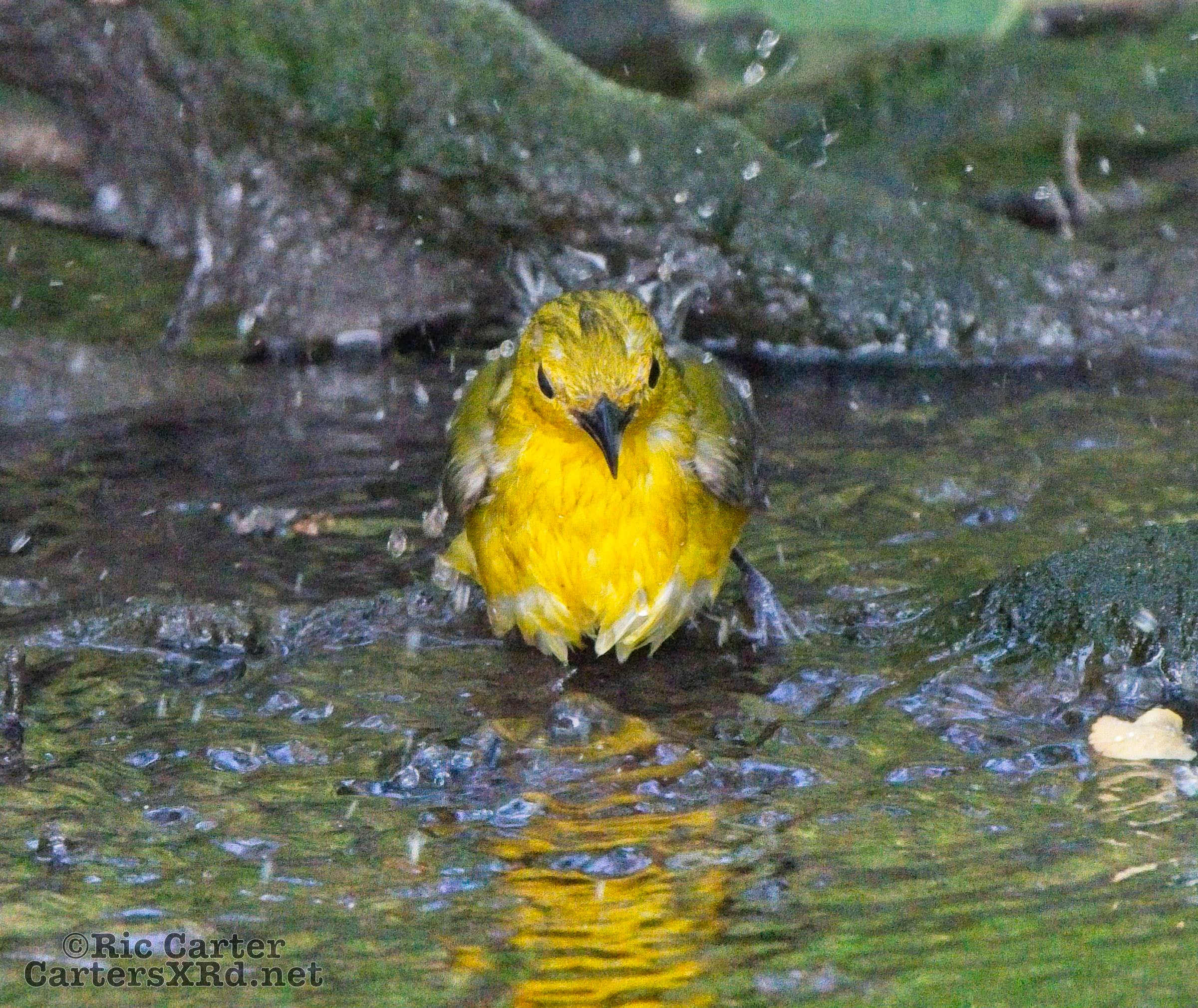We had a pair of golden warblers nest in the yard last year. We think they returned a couple of weeks ago. On May 5, they both were “friendly” and did not startle too seriously as we sat on the pier. The female enjoyed a bath in Tranters Creek before the male showed up to admire her.