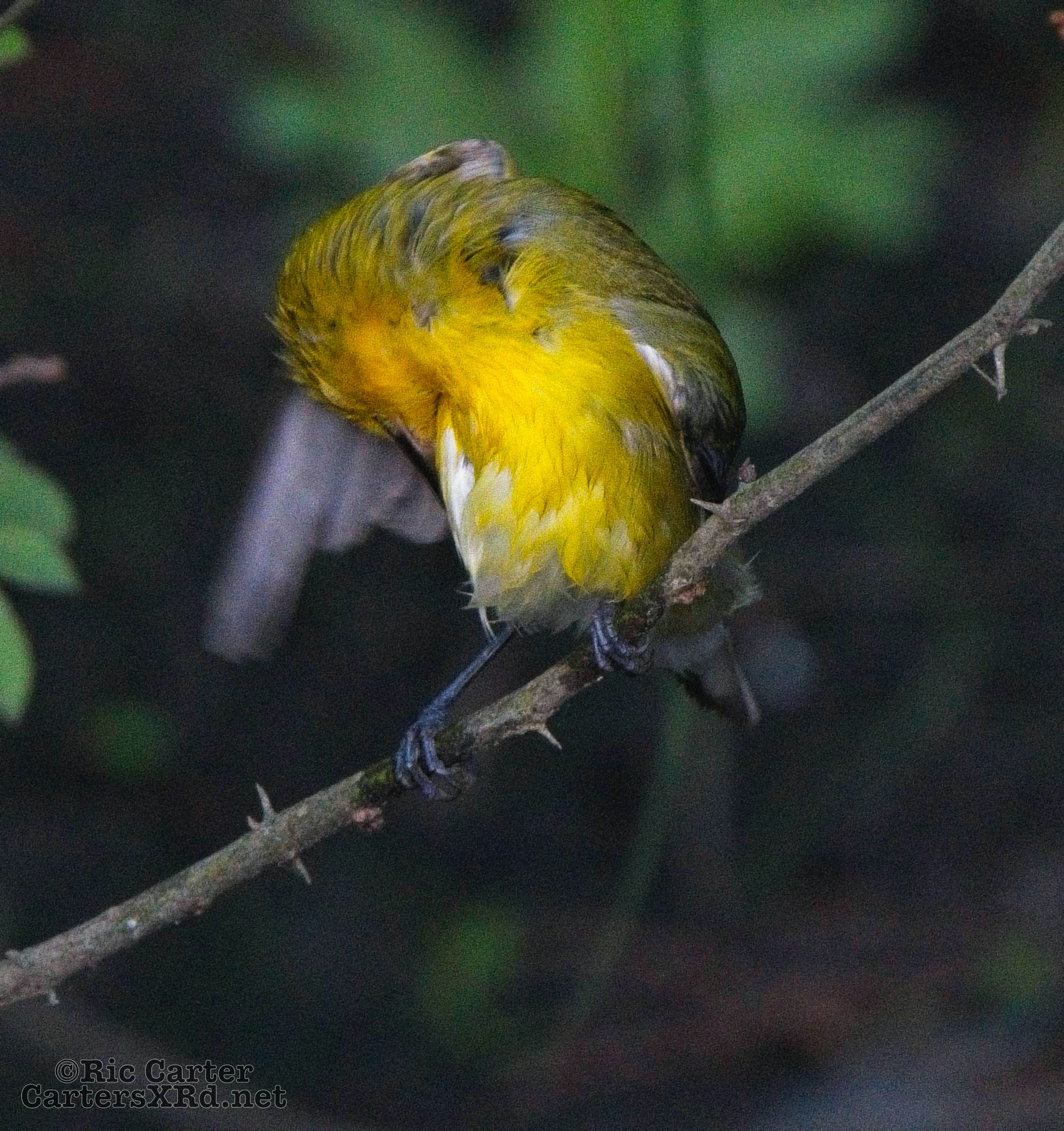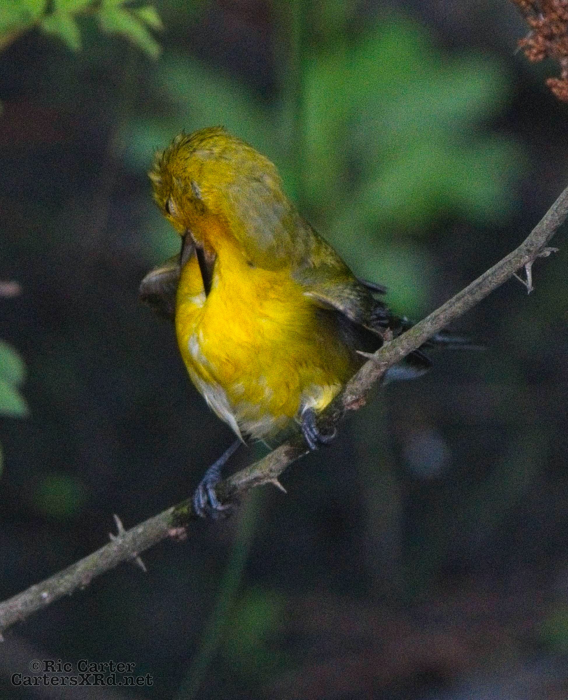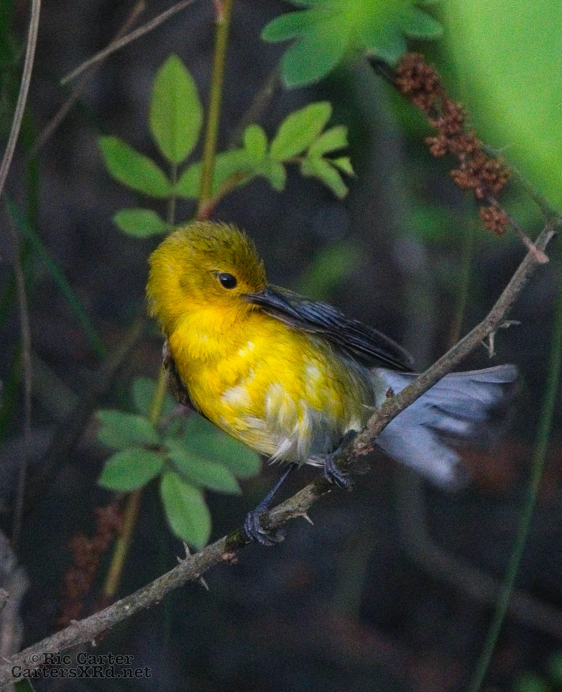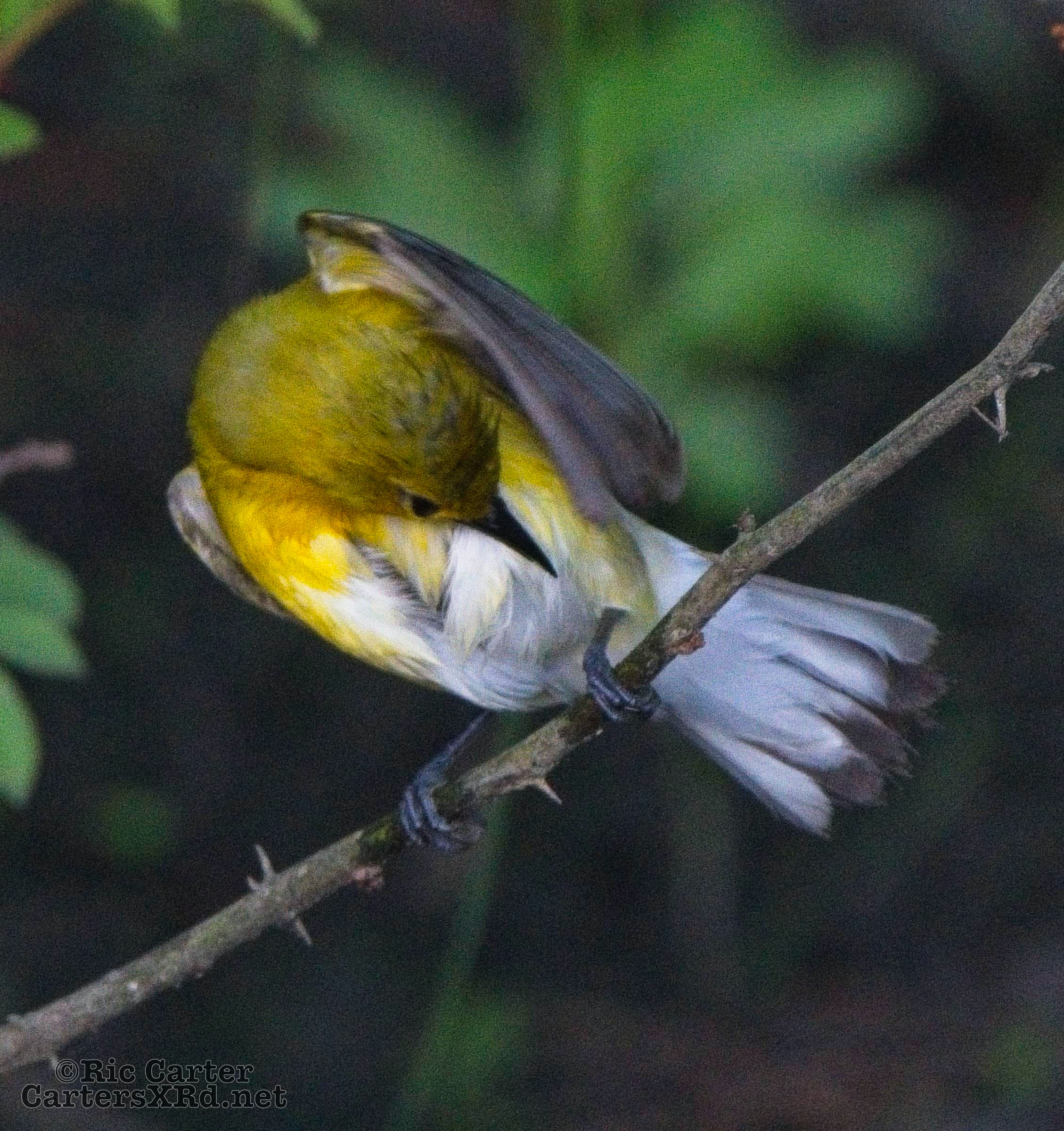 We had a pair of golden warblers nest in the yard last year. We think they returned a couple of weeks ago. On May 5, they both were “friendly” and did not startle too seriously as we sat on the pier. The female enjoyed a bath in Tranters Creek before the male showed up to admire her.