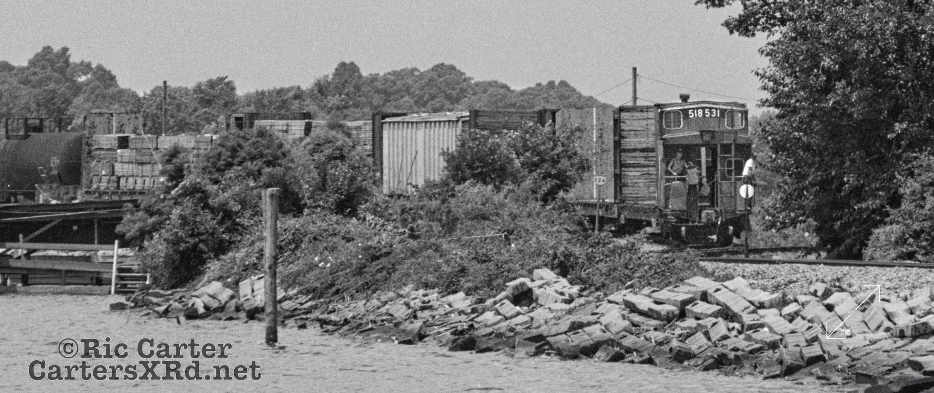 A Norfolk Southern freight westbound past Havens Gardens approaching the Pamlico River trestle in Washington NC, July 1989.