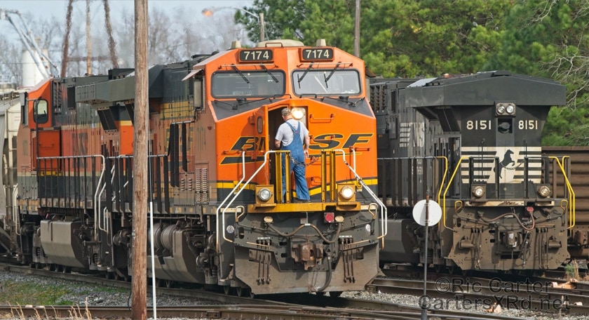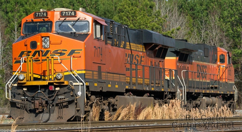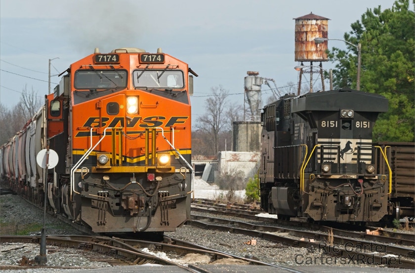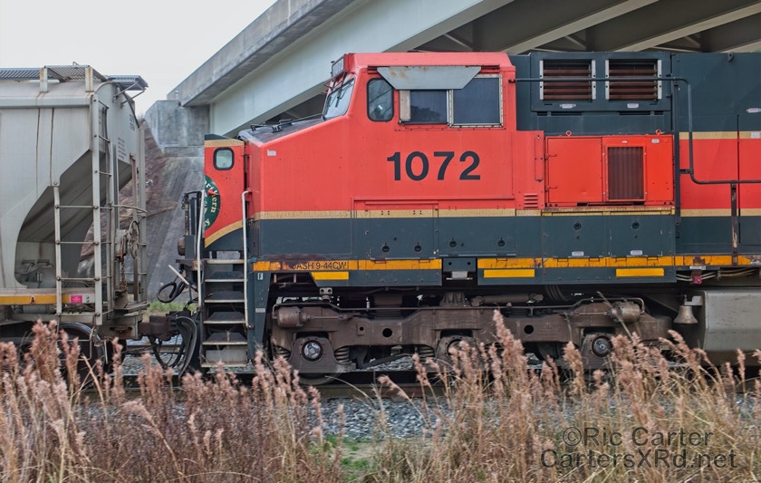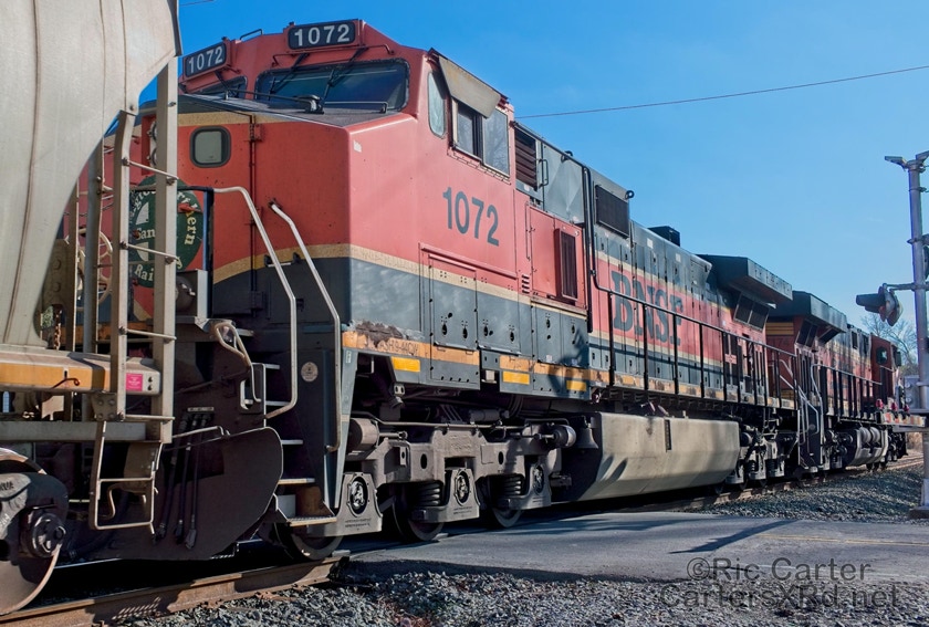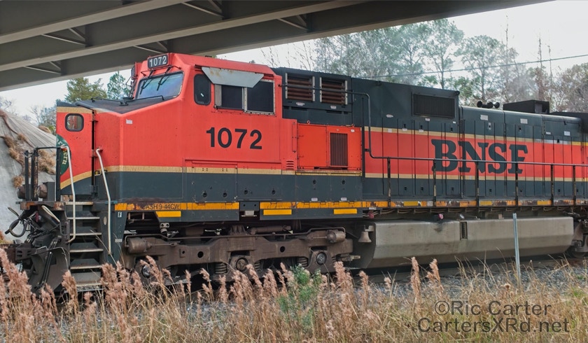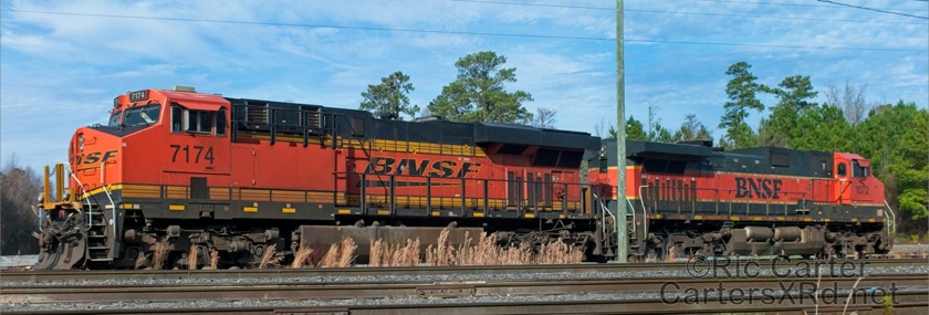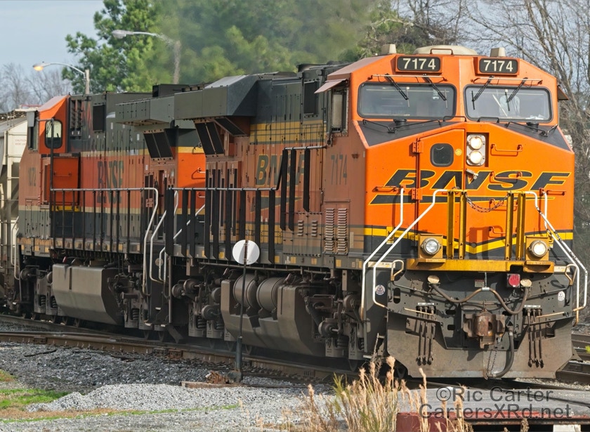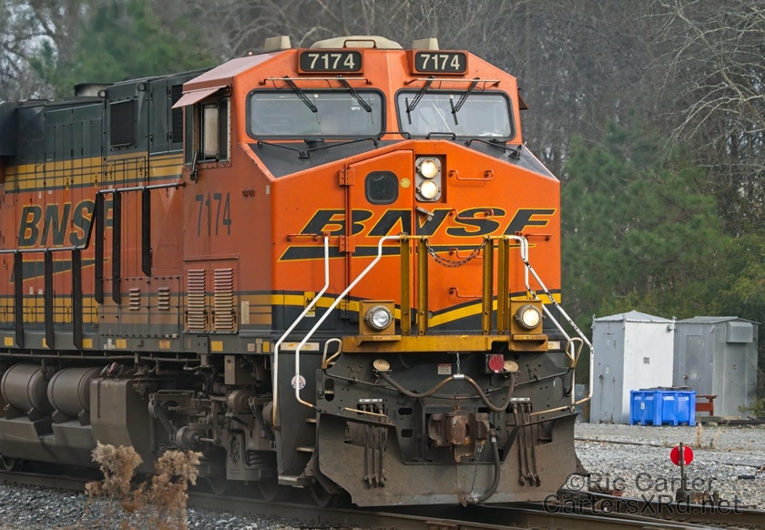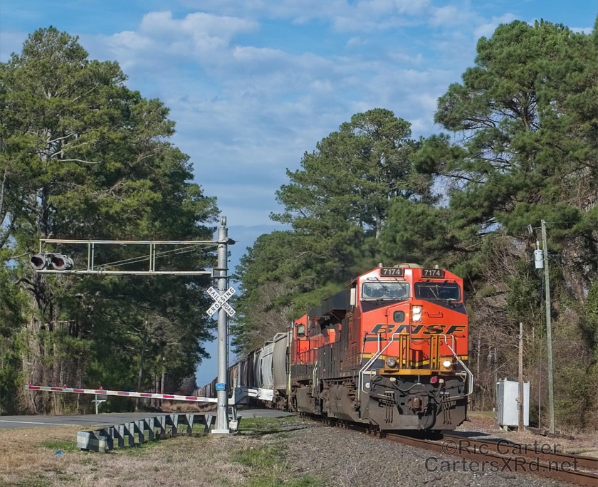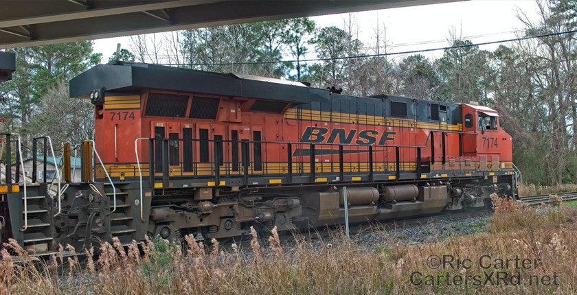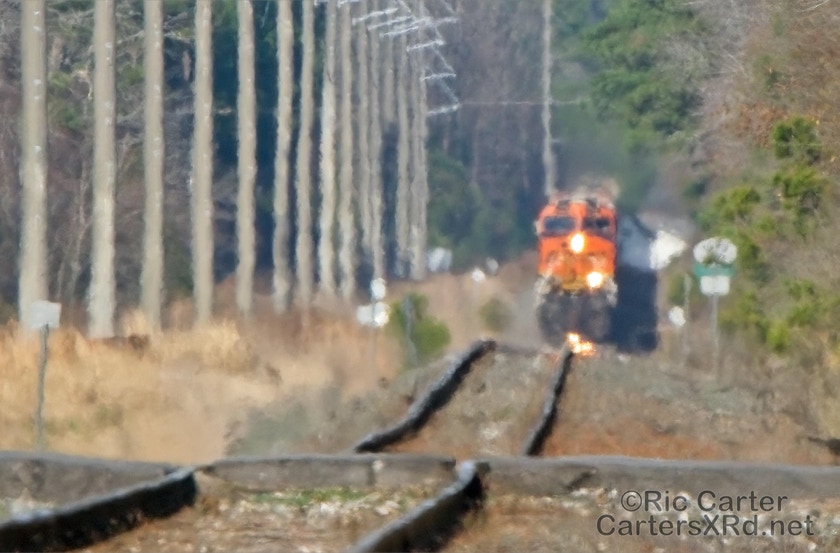 What a nice way to round out the train year — a little holiday color added to the yard in Chocowinity. Two BNSF units overnighted in the yard awaiting a December 29 phosphate unit train (60U). Here are pictures in the yard and passing through Vanceboro on its way west.